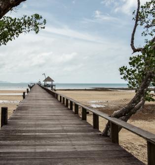 เป็นแหลมที่ตั้งอยู่ปลายหาดด้านตะวันออกของเกาะหมาก หากคุณจะไปแหลมสนจะพบทางแยกผ่านสวนมะพร้าวและสวนยางพาราไปยังแหลมสน นับเป็นบริเวณที่มีต้นสนทะเลขึ้นอยู่เต็มหาดสมชื่อกับแหลมสน สนทะเลจัดเป็นไม้ที่โตเร็ว สามารถเจริญเติบโตได้ดีในดินเกือบทุกชนิดและให้ประโยชน์ได้หลายอย่างด้วยกัน เช่น ใช้เป็นเชื้อเพลิงซึ่งได้รับการขนานนามว่าเป็นไม้ฟืนที่ดีที่สุดในโลกและสามารถนำไม้มาใช้เผาเป็นถ่านได้ดี นอกจากนี้ยังมีการใช้ประโยชน์ในการฟอกหนัง การทำกระดาษ เนื้อไม้ใช้ทำเสาเข้ฒในการก่อสร้าง รวมทั้งการใช้เป็นสุมนไพรโดยนำเปลือกมาต้มกับน้ำเป็นยาฝาดสมานใช้รักษาโรคท้องเดินเรื้อรังและแก้บิด กิ่งแขนงเอามาชงกับน้ำรับประทานเป็นยาขับปัสสาวะ