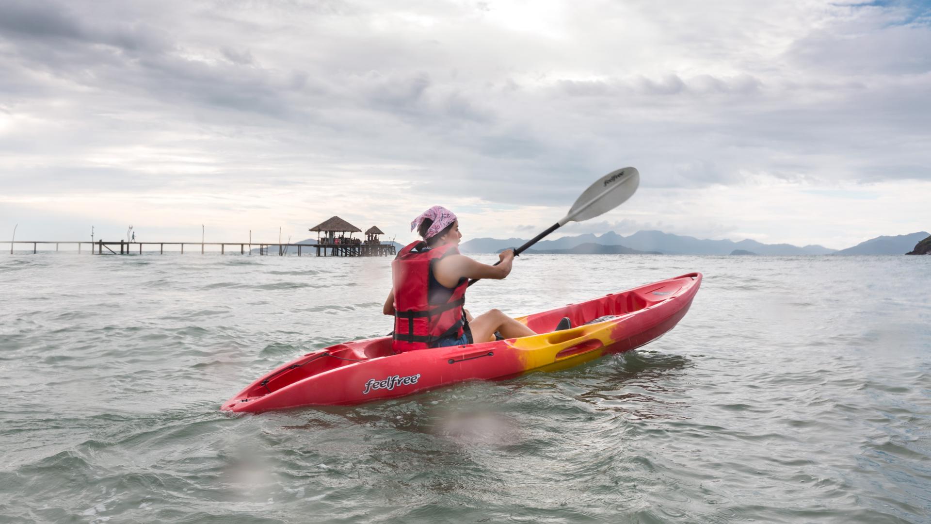 เพื่อให้เข้ากับแนวคิด Low Carbon บนเกาะหมากจึงไม่มีบานาน่าโบ๊ตหรือเจ็ตสกี แต่มีกิจกรรมพายเรือคายักและเล่นเรือใบเป็นอีกหนึ่งทางเลือกสำหรับนักท่องเที่ยวที่ชื่นชอบการออกกำลังและเป็นมิตรกับสิ่งแวดล้อม โดยมีเส้นทางสั้นๆ ใช้เวลาไม่นานก็ไปเที่ยวเล่นเกาะใกล้ๆ ได้ เช่น เกาะขาม เกาะผี โดยบริเวณอ่าวสวนใหญ่เหมาะสำหรับการพายคายักและเล่นเรือใบ เพราะลมไม่แรงคลื่นไม่สูง และน้ำไม่ลึกมาก